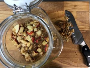 Jabolčno-Orehov fermentiran čatni je odlična in zdrava popestritev zajtrka ali sladice. Mikroorganizmi v fermentiranem čatniju bodo razgradili sladkor namesto nas in naredi zajtrk ali sladico lahko in prebavljivo! Poleti pa to še kako dobro dene našemu prebavnemu traktu! Torej, hitro na delo in si po spodnjem receptu pripravite kozarec (500g) fermentiranega čatnija.